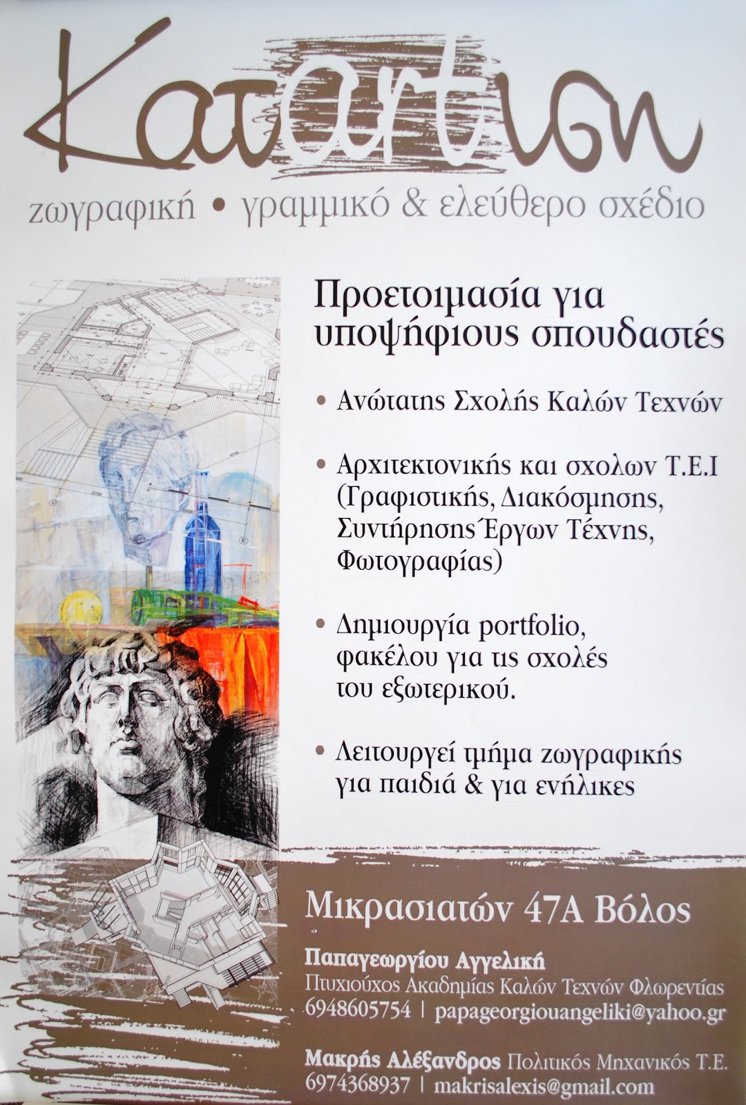 του σχεδίου. Η πολυετής πείρα μας, η αγάπη για το αντικείμενο και η όρεξη για δημιουργία αποτελούν εγγύηση τόσο για την ερασιτεχνική ενασχόληση με τη ζωγραφική όσο και για την υπεύθυνη προετοιμασία και επιτυχία στις αντίστοιχες σχολές.