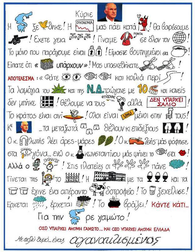 Διαβαθμισμένη επιστολή σε ειδικό κώδικα γραφής απέστειλε “Αγανακτισμένος” στον πρωθυπουργό. Η επιστολή προκάλεσε Σοκ και Δέος. Κλήθηκαν ειδικά επιτελεία γραφολόγων προκειμένου να αναλυθεί το μήνυμα. Αποσπάσαμε αντίγραφο της κωδικοποιημένης επιστολής και το δημοσιεύουμε. η επιστολή έχει ώς εξης: