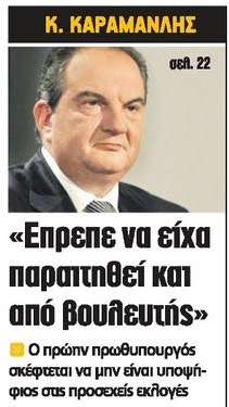Ο πρώην πρωθυπουργός σκέφτεται να μην είναι υποψήφιος στις επόμενες εθνικές εκλογές, σύμφωνα με την Real News! Όχι γιατί απέκτησε τσίπα και κατάλαβε τι έκανε στην χώρα! Αλλά γιατί κουράστηκε!!! Φανταστείτε να έχουμε εκλογές Σεπτέμβριο ή Οκτώβριο. Μέσα στις ζέστες τώρα που να τρέχει. Αθάνατε Κωστάκη…Αξίζει να σημειώσουμε ότι η τελευταία φορά που ο Κώστας Καραμανλής έκανε μια δημόσια συνολική πολιτική παρέμβαση, ήταν στις 7 Νοεμβρίου 2009, κατά τη διάρκεια του έκτακτου συνεδρίου της ΝΔ για την εκλογή του νέου προέδρου του κόμματος. Από τότε τίποτα. Αυτό κι αν είναι κούρασηηηηηηηη!