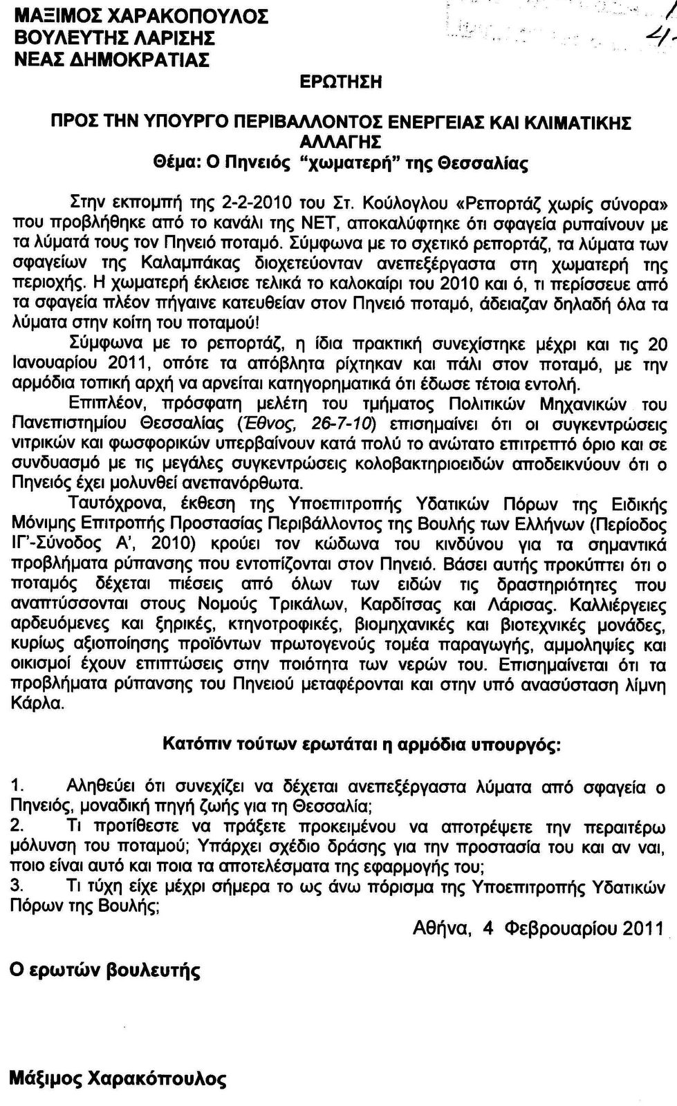 Απαντήθηκε από το Υπουργείο Περιβάλλοντος, Ενέργειας και Κλιματικής Αλλάγής, η ερώτηση του βουλευτή ν. Λάρισας της ΝΔ κ. Μάξιμου Χαρακόπουλου, με θέμα “Ο Πηνειός “χωματερή” της Θεσσαλίας”.