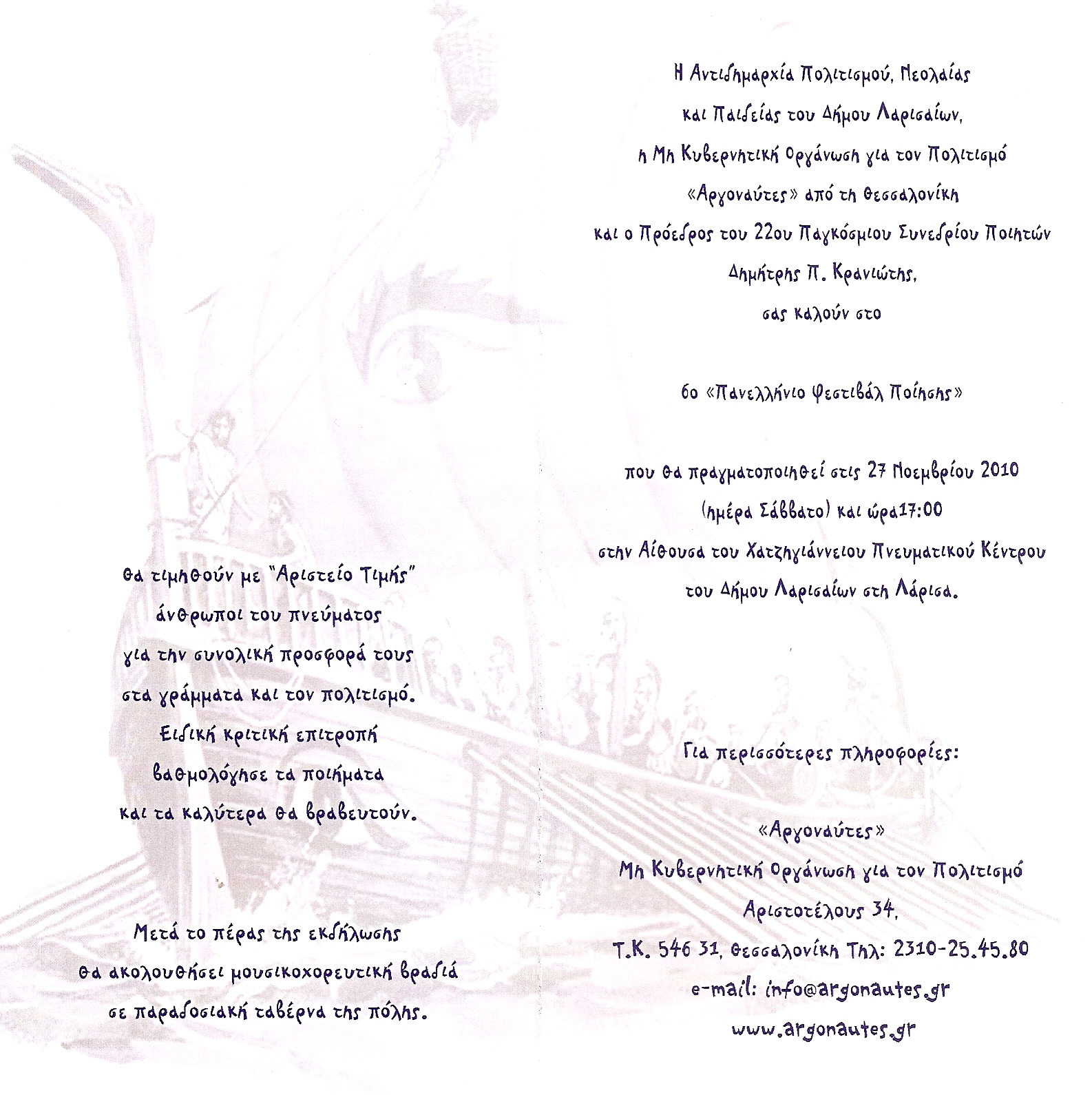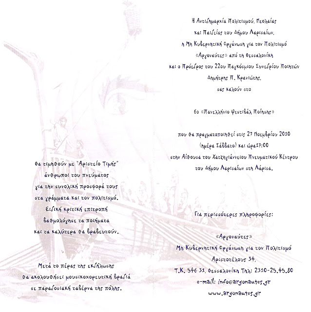 Η Αντιδημαρχία Πολιτισμού, Νεολαίας και Παιδείας του Δήμου Λαρισαίων, η Μη Κυβερνητική Οργάνωση για τον Πολιτισμό «Αργοναύτες» από τη Θεσσαλονίκη και ο Πρόεδρος του 22ου Παγκόσμιου Συνεδρίου Ποιητών κ. Δημήτρης Π. Κρανιώτης, σας καλούν στο
