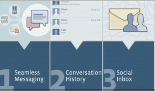 Η μεγάλη διαφορά των μηνυμάτων του Facebook από τους “εχθρούς” του είναι ότι ενσωματώνει email, τα κλασσικά μηνύματα του Facebook, SMS, μηνύματα chat, όλα σε ένα. Ακόμη και οι κλήσεις μέσω internet (VoIP) μπορούν αν συμπεριληφθούν. Όλα σε ένα νοικοκυρεμένα που λέει και γνωστή διαφήμιση. Και για όλα αυτά δεν είναι υποχρεωτικό να έχεις διεύθυνση της μορφής mail@facebook.com, υπάρχει δυνατότητα να χρησιμοποιήσουμε και την ήδη υπάρχουσα διεύθυνση μας (π.χ. στο Gmail).