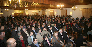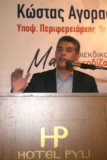 Μιλώντας στην ασφυκτικά γεμάτη αίθουσα του ξενοδοχείου «Πύλη» παρουσία του βουλευτή κ. Νίκου Λέγκα, του νομάρχη κ. Ηλία Βλαχογιάννη, του πρώην βουλευτή κ. Θόδωρου Σκρέκα και υποψηφίων