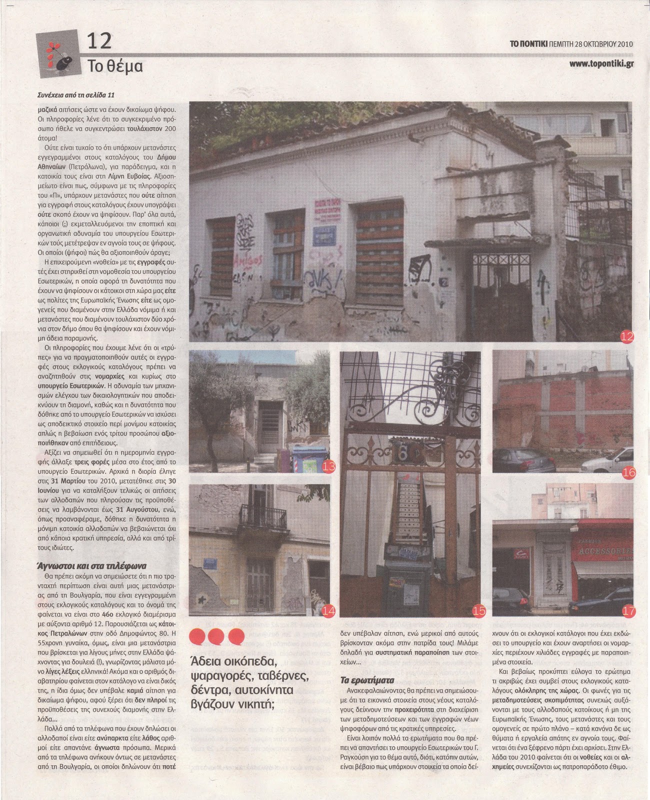 Πράγματι, η έρευνα της εφημερίδας έδειξε ότι δηλώθηκαν ως μόνιμοι τόποι κατοικίας των παραπάνω, οικόπεδα γεμάτα μπάζα, εργοτάξια, μισογκρεμισμένα σπίτια, μια χασαποταβέρνα και ένα ιχθυοπωλείο.