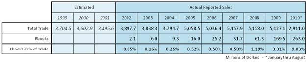 Οι πωλήσεις του συνόλου των εμπορικών βιβλίων (όλων εκτός των ακαδημαϊκών) στις ΗΠΑ για την περίοδο Ιανουάριος-Αύγουστος 2010 ανήλθαν στα $2,91 δις. Την ίδια περίοδο οι πωλήσεις των e-books ήταν $263 εκατομμύρια. Έτσι, οι πωλήσεις των e-books αντιστοιχούν στο 9,03% των πωλήσεων συνολικά των εμπορικών βιβλίων, σε σύγκριση με ποσοστό 3.31% το τέλος τους 2009. Τα $263 εκατομμύρια των πωλήσεων e-books της περιόδου Ιανουαρίου-Αυγούστου 2010 σε σύγκριση με τα $89,8 εκατομμύρια την ίδια περίοδο το 2009 συνιστούν αύξηση 193%. Τον Αύγουστο του 2010 οι πωλήσεις ήταν κατά 172,4% μεγαλύτερες σε σχέση με τον ίδιο μήνα πέρυσι.
