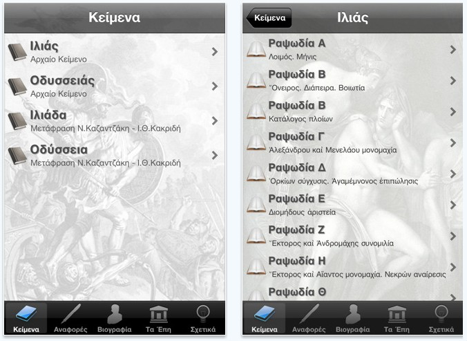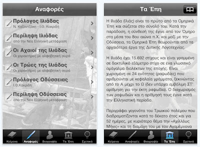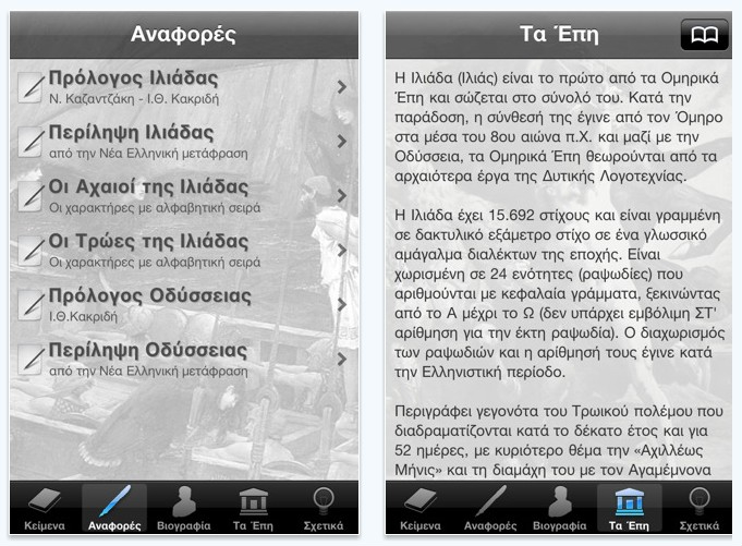 Μια ωραία εφαρμογή για iPhone και iPod Touch κυκλοφόρησε στις 23 Σεπτεμβρίου από τον Περικλή Μαραβελάκη. Είναι δωρεάν, ονομάζεται “Ομήρου Έπη” και περιλαμβάνει τα Ομηρικά Έπη, Ιλιάδα και Οδύσσεια, τόσο στο πρωτότυπο κείμενο στα αρχαία ελληνικά όσο και σε νεοελληνική μετάφραση του Νίκου Καζαντζάκη και του Ι. Θ. Κακριδή. Η μετάφραση της Ιλιάδας είναι αυτή που χρησιμοποιείται και στα σχολικά βιβλία. Περιλαμβάνεται επίσης ο πρόλογος και η περίληψη και των δύο έργων από τους μεταφραστές και κατάλογος με τους χαρακτήρες των έργων. Η μετάφραση αυτή είναι κλασική καθώς έχει γίνει από δύο σημαντικές φυσιογνωμίες της νεοελληνικής λογοτεχνίας και της κλασικής φιλολογίας αντίστοιχα και έχει και αυτόνομη αισθητική αξία. Στις 3 πρώτες ημέρες διάθεσης, τα “Ομήρου Έπη” είναι η νούμερο 1 εφαρμογή στην κατηγορία βιβλίων στο ελληνικό AppStore, έχοντας 5/5 αστέρια αξιολόγησης και πάνω από 3000 downloads.