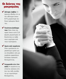 Αν έχετε δυνατή χειραψία και καλή ισορροπία όταν στέκεστε στο ένα πόδι, θα ζήσετε ως τα βαθιά γεράματα. Οι άλλοι δύο από τους τέσσερις δείκτες που μαρτυρούν αν θα μακροημερεύσετε είναι η ταχύτητα με την οποία σηκώνεστε από μια καρέκλα και το πόσο γρήγορα βαδίζετε. Ερευνα του Συμβουλίου Ιατρικών Ερευνών (ΜRC), που δημοσιεύτηκε χθες στη «Βρετανική Ιατρική Επιθεώρηση», έδειξε πως όσοι είναι ταχύτεροι, δυνατότεροι ή έχουν καλύτερη ισορροπία στις δοκιμασίες αυτές θα ζήσουν περισσότερο. Σκοπός ήταν να βρεθεί αν οι απλοί αυτοί παράγοντες μπορούν να χρησιμεύσουν στο να εντοπιστεί ποιοι από τους ηλικιωμένους που ζουν μόνοι στο σπίτι τους θα είχαν ανάγκη μεγαλύτερης βοήθειας. Οι γιατροί του ΜRC εξέτασαν 57 έρευνες που είχαν μετρήσει τις επιδόσεις ανθρώπων στους τέσσερις αυτούς τομείς και είχαν καταγράψει στη συνέχεια πότε πέθανε καθένας από αυτούς- εννοείται ότι εξαιρέθηκαν όσοι υπέφεραν από ασθένειες. Είδαν ότι υπήρχε στενή σχέση ανάμεσα στις κακές επιδόσεις στα τεστ αυτά και στον πρόωρο θάνατο ενώ, αντιθέτως, όσο καλύτερα τα πήγαινε κάποιος, τόσο περισσότερες πιθανότητες είχε να πεθάνει αργότερα. Στις 14 έρευνες (σε 53.500 ανθρώπους) που αφορούσαν τη δύναμη της λαβής, το ποσοστό θανάτου ανάμεσα στους πιο αδύναμους ήταν κατά 1,67 φορές υψηλότερο από τους πιο δυνατούς. Η δύναμη της λαβής τους μετρήθηκε αφού τους ζητήθηκε να σφίξουν ένα χερούλι όσο δυνατότερα μπορούσαν. Για τον υπολογισμό της ελήφθησαν υπ΄ όψη η ηλικία, το φύλο και η σωματική διάπλαση.