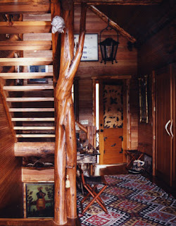 Αυτή η πλάγια είσοδος, σχεδιασμένη από τη Mimi Maddock McMakin των Kemble Interiors προβάλλει ένα έθνικ χαλί και ένα κρεμαστό φαναράκι, δίπλα από μια ξύλινη σκάλα.