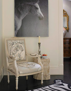 Η Γαλλία συναντά την California σε αυτή την ρομαντική είσοδο, σχεδιασμένη από τον Stephen Shubel. Μια Louis XVI-style καρέκλα δίπλα από ένα ασπρισμένο κορμό δεντρου και μια φωτογραφία αλόγου από την Susan Friedman είναι όλα όσα χρειάζεται.