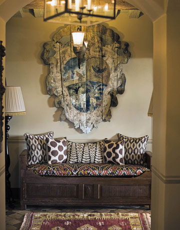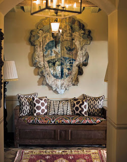 Η Cathy Kincaid έφτιαξε μια είσοδο που παραπέμπει σε παλιές εποχές με το επιβλητικό οικόσημο, τον ξύλινο στιβαρό πάγκο και τα πουά μαξιλάρια σε μια πιο ανάλαφρη νότα.