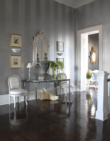 Ο designer Ned Marshall ήθελε αυτή την είσοδο στο δεύτερο όροφο να είναι ουδέτερη, αλλά κατ’ουδένα λόγο ανιαρή. Έβαψε τους τοίχους με ασημένια μπογιά και πρόσθεσε πιο σκούρες γκρι ρίγες.