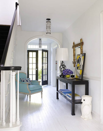 Ο designer Jonathan Adler ήθελε αυτή την είσοδο να έχει ένα καθαρό, αεράτο look. Το λευκό κυριαρχεί με την κονσόλα σε σκούρο ξύλο και την πολυθρόνα σε τυρκουάζ να δίνουν την απαραίτητη δόση χρώματος.