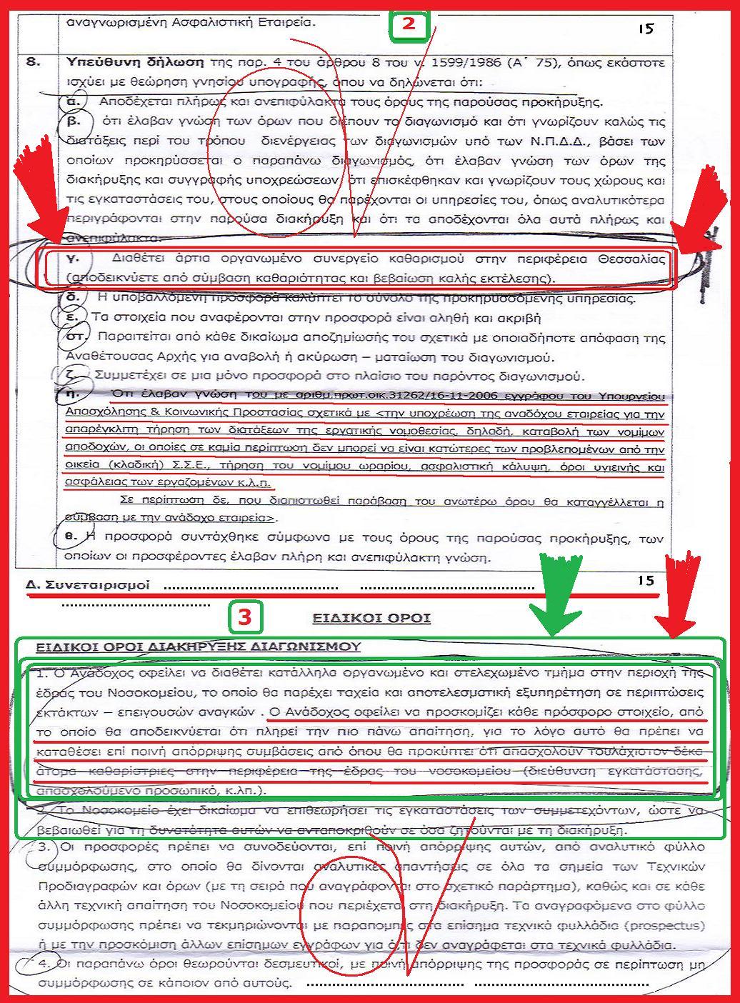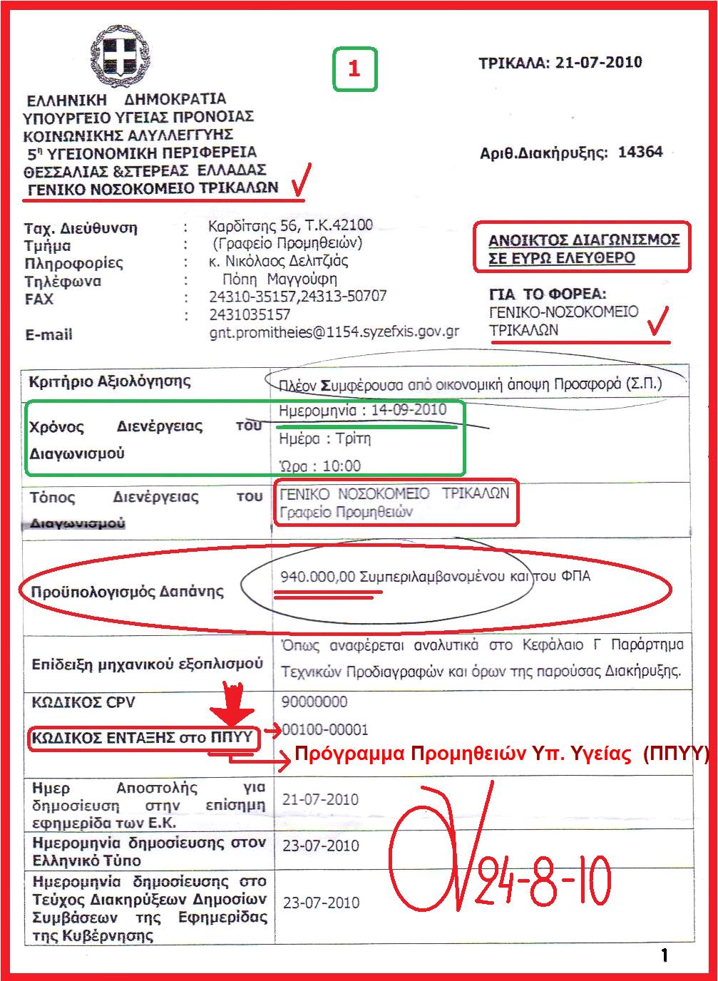Όπως ανεχόντουσαν επί 4ετία οι γαλαζοπράσινες απαυτές, τις απευθείας παράνομες προμήθειες και αναθέσεις εργολαβιών και γνώριζαν στο διεφθαρμένο υπουργείο ότι παρανομούν, όπως παράνομα ασκούσαν και ασκούν αφόρητες πιέσεις για εγκρίσεις Ε.Σ. των εμφανώς παράνομων δαπανών, με την ίδια άνεση της ασυδοσίας που τους δίνει η κρατική εξουσία, ενέκριναν τη διακήρυξη Αρ. 14364 / 21-7-2010, για ψευδοδιενέργεια ψευδοδιαγωνισμού ανάδειξης εργολάβου καθαριότητας, στο Γενικό Νοσοκομείο Τρικάλων, ετήσιας δαπάνης 940.000,00 € !!!!!!!!!