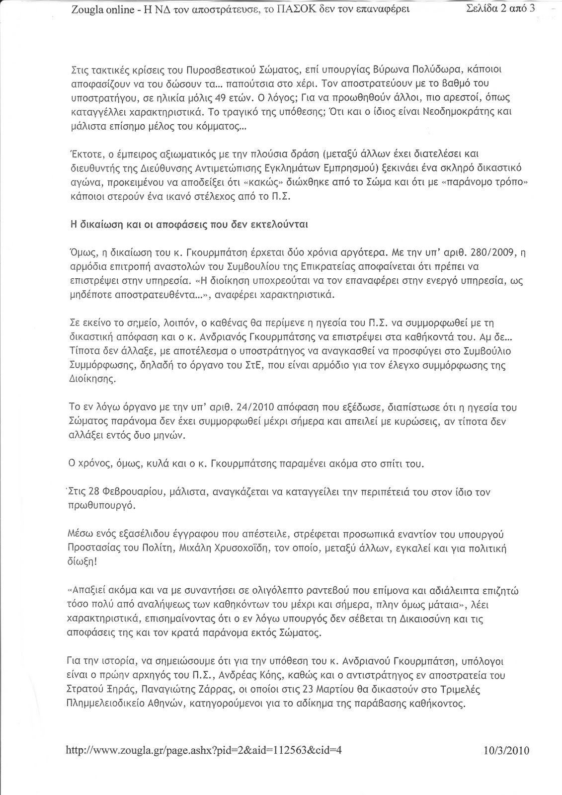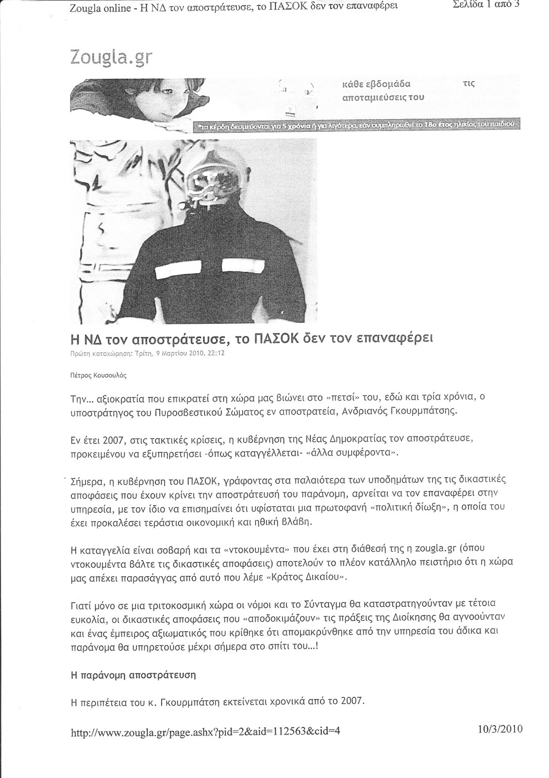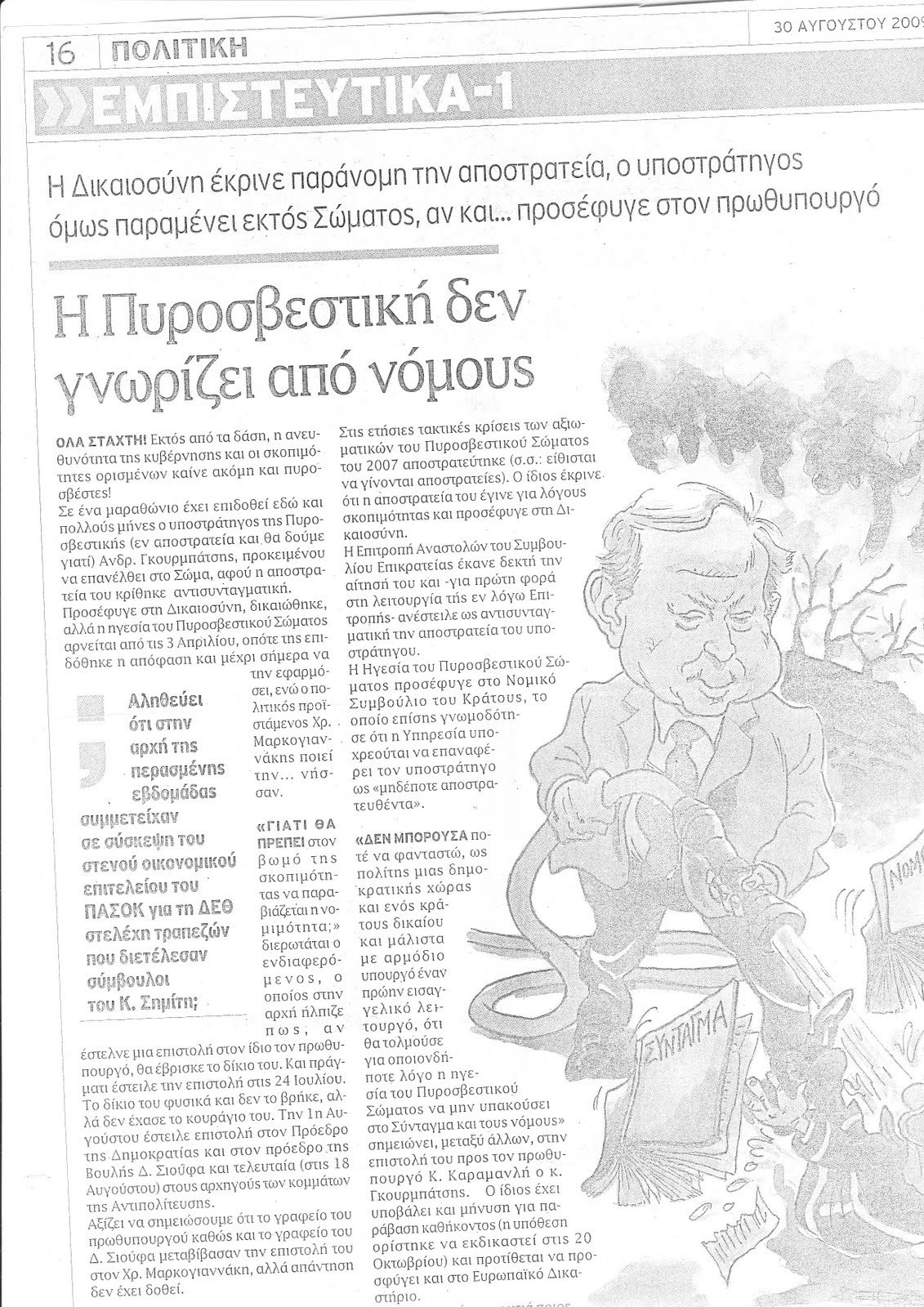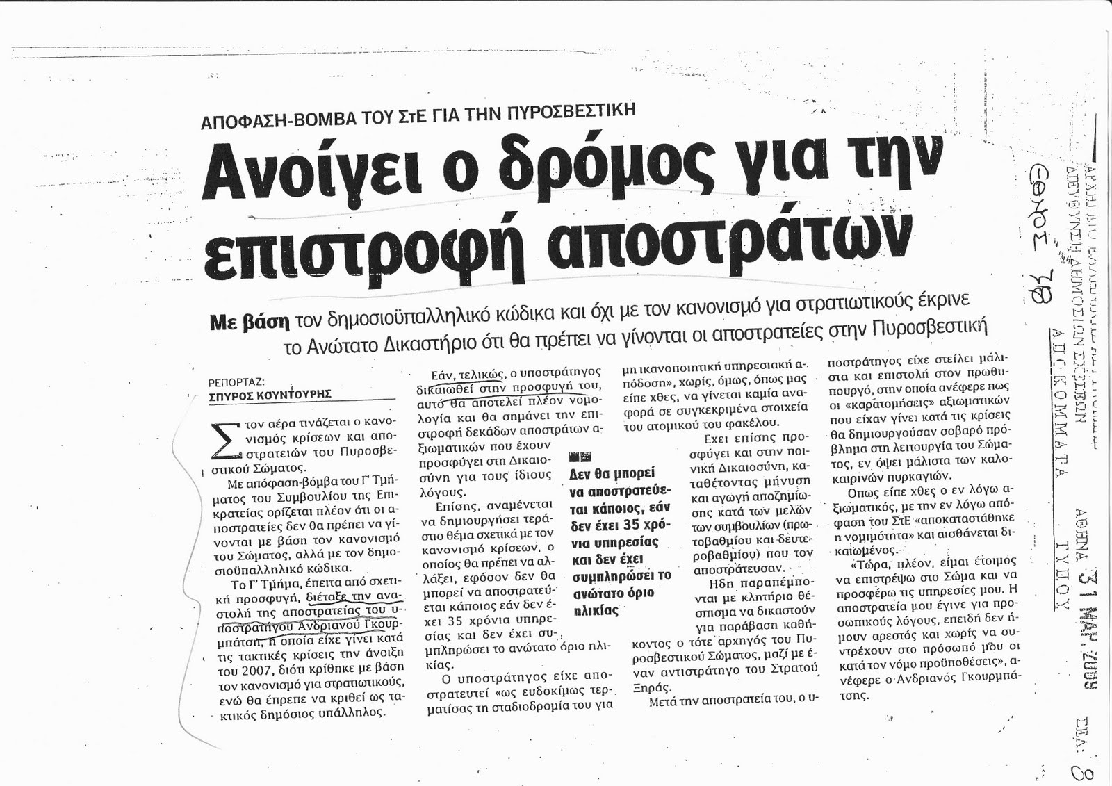 αυτής. Μήνυσε τα μέλη του Συμβουλίου που τον αποστράτευσαν με αποτέλεσμα να παραπευθούν με κλητήριο θέσπισμα για να δικαστούν για ΠΑΡΑΒΑΣΗ ΚΑΘΗΚΟΝΤΟΣ ο τότε Αρχηγός του Σώματος (Ανδρέας Κόης) μαζί με έναν Αντιστράτηγο του Στρατού Ξηράς (Παναγιώτης Ζάρας).Η Επιτροπή αναστολών του ΣτΕ με την 280/2009 απόφασή της έκρινε (για πρώτη φορά)αντισυνταγματική τη αποστρατεία του και την ανέστειλε, γράφει η απόφαση συγκεκριμένα: