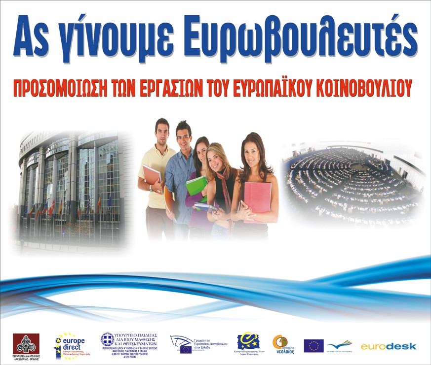 Το Κέντρο Ευρωπαϊκής Πληροφόρησης – Europe Direct Κομοτηνής και το Γραφείο Αγωγής Υγείας της Δ/θμιας Δ/νσης Εκπ/σης Ν. Ροδόπης, με την υποστήριξη του Γραφείου του Ευρωπαϊκού Κοινοβουλίου στην Ελλάδα, του Ινστιτούτου Νεολαίας – Εθνική Υπηρεσία Προγραμμάτων Ευρωπαϊκής Ένωσης «Νέα Γενιά σε Δράση» και EURODESK και υπό την αιγίδα της Περιφέρειας Ανατολικής Μακεδονίας & Θράκης θα πραγματοποιήσουν την Παρασκευή, 16 Απριλίου 2010 από τις 10:00 έως τις 15:00 στο Αμφιθέατρο του Μουσικού Σχολείου Κομοτηνής, Προσομοίωση των εργασιών του Ευρωπαϊκού Κοινοβουλίου, με τίτλο: