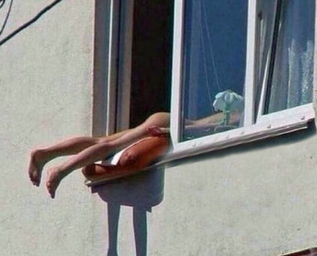 Μια νεαρή γυναίκα με το που είδε ήλιο βρήκε τον εικονιζόμενο εντελώς πρωτότυπο τρόπο για να κάνει ηλιοθεραπεία, μένοντας φυσικά τσίτσιδη, η μισή δε να κρέμεται (σε αυτή την κατάσταση) έξω από το παράθυρο του διαμερίσματός της.