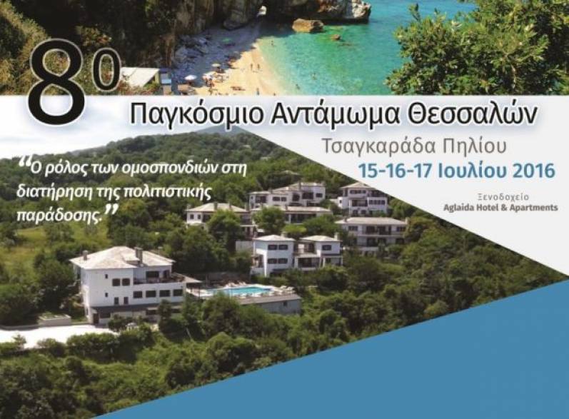 Στην Τσαγκαράδα Πηλίου στις 15, 16 και 17 Ιουλίου 2016 στο ξενοδοχείο “Aglaida Hotel & Apartments”, θα πραγματοποιηθεί το 8ο Παγκόσμιο Αντάμωμα Θεσσαλών, που διοργανώνει η Παγκόσμια Συνομοσπονδία Θεσσαλών «Ασκληπιός».