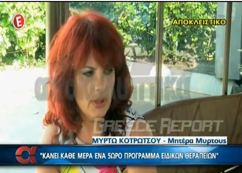 Βίντεο: «Η Μυρτώ δε μιλάει, ουρλιάζει μόνο όταν πονάει»-Ξέσπασμα της μητέρας της Μυρτούς από τη Λάρισα Από ΘΕΣΣΑΛΟΣ - 2 Ιουνίου 2014 0 117 Αποκλειστική συνέντευξη της μητέρας της Μυρτούς από τη Λάρισα στο κανάλι “Ε” και την εκπομπή “ΑΠΟΚΑΛΥΠΤΙΚΑ”. Δείτε το βίντεο: