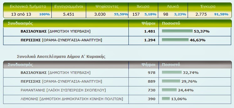 Δήμαρχος Σκοπέλου ο Βασιλούδης Χρήστος – Δείτε τα τελικά αποτελέσματα Από ΘΕΣΣΑΛΟΣ - 26 Μαΐου 2014 0 206 Με καταμετρημένα τα 13 από τα 13 εκλογικά τμήματα του Δήμου Σκοπέλου ο Βασιλούδης Χρήστος είναι ο Δήμαρχος Σκοπέλου με ποσοστό 53,37% Δείτε τα τελικά αποτελέσματα