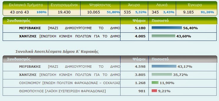 Δήμαρχος Φαρακαδόνας ο Θανάσης Μεριβάκης – Δείτε τα τελικά αποτελέσματα Από ΘΕΣΣΑΛΟΣ - 26 Μαΐου 2014 0 198 Με καταμετρημένα τα 43 από τα 43 εκλογικά τμήματα του Δήμου Φαρκαδόνας ο Θανάσης Μεριβάκης είναι ο Δήμαρχος Φαρκαδόνας με ποσοστό 56,40% Δείτε τα τελικά αποτελέσματα