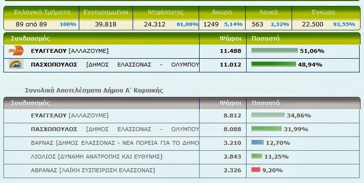 Δήμαρχος Ελασσόνας ο Νίκος Ευαγγέλου – Δείτε τα τελικά αποτελέσματα Από ΘΕΣΣΑΛΟΣ - 26 Μαΐου 2014 0 215 Με καταμετρημένα τα 89 από τα 89 εκλογικά τμήματα του Δήμου Ελασσόνας ο Νίκος Ευαγγέλου είναι ο Δήμαρχος Ελασσόνας με ποσοστό 51,06%. Δείτε τα αποτελέσματα