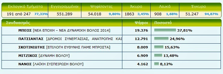 Αποτελέσματα σε 191 από 247 εκλογικά τμήματα στο Δήμο Βόλου Από ΘΕΣΣΑΛΟΣ - 19 Μαΐου 2014 0 178 κάνετε κλικ στην εικόνα