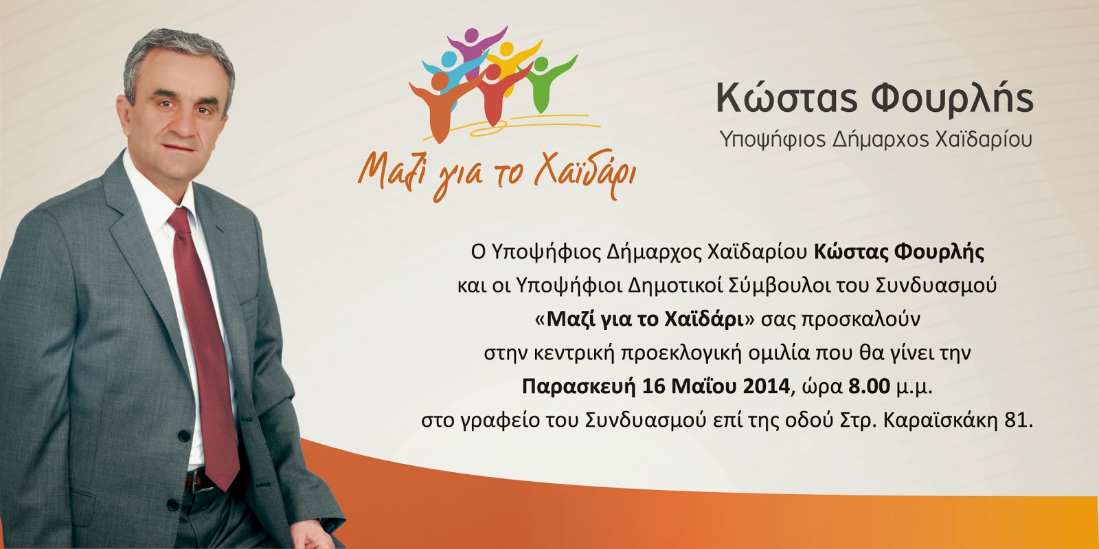 Κώστας Φουρλής: Ένας Καρδιτσιώτης υποψήφιος Δήμαρχος Χαϊδαρίου… Από ΘΕΣΣΑΛΟΣ - 12 Μαΐου 2014 0 194 Από τη Μαραθέα Καρδίτσας είναι ο δικηγόρος, Υποψήφιος Δήμαρχος Χαϊδαρίου, Κώστας Φουρλής… Θεσσαλοί παντού! Ακόμα και στα Αθηναϊκά ψηφοδέλτια… Από τα ΘΕΣΣΑΛΙΚΑ ΝΕΑ-kamposnews ευχές για καλή επιτυχία!