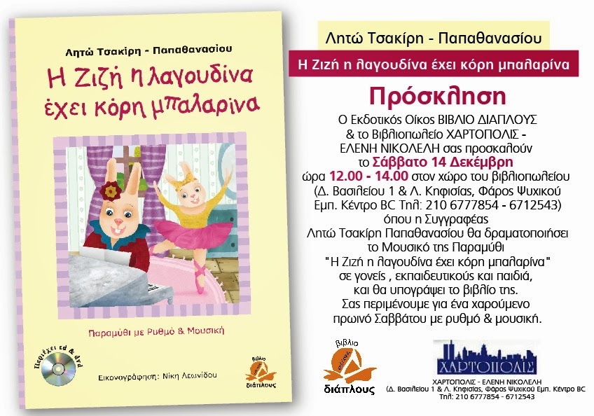 Παπαθανασιου “η Ζιζη η λαγουδίνα έχει κόρη μπαλαρίνα” ταξιδεύει στις 14 Δεκέμβρη στην Αθήνα για μιαν μουσική παρουσίαση του στον Φάρο Ψυχικού στο Βιβλιοπωλείο Χαρτοπολις .