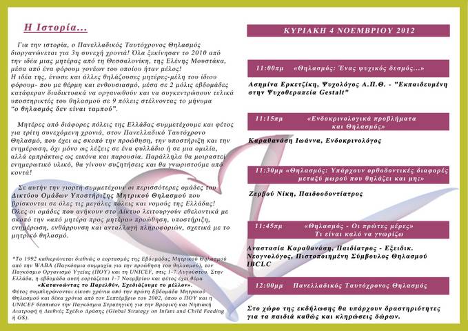 των Ομάδων Υποστήριξης Μητρικού Θηλασμού και Μητρότητας, σας προσκαλεί την Κυριακή 4 Νοεμβρίου 2012, σε μια