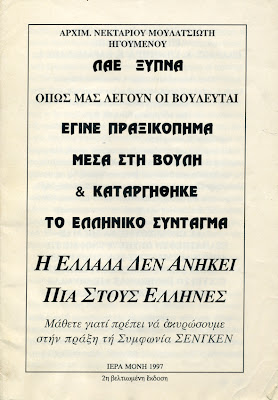 – Γνωρίζετε ότι βάσει κοινοτικών εντολών και των διαφόρων συνθηκών καταργούνται η ελληνική σημαία, ο εθνικός ύμνος, οι εθνικές εορτές, η ελληνική ιστορία, το Ορθόδοξο Πάσχα; (διαβάστε το βιβλιαράκι του 1997 και θα δείτε την επιβεβαίωσή μας).